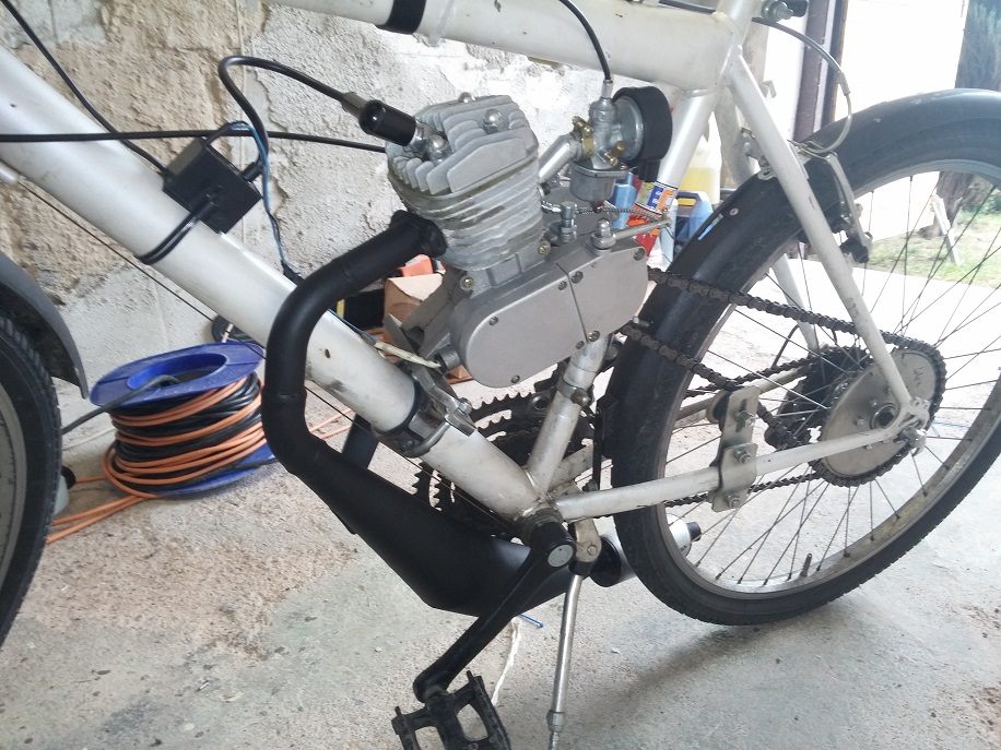,,,jen musíš vyřešit držák na motor.Buď dokoupíš ten set,co se dá sehnat na internetu, nebo si tam navaříš trubku navíc,nebo něco,co více bude ladit s linií celého kola. Myslím,že kolo je z ocele, čili nasvařit tam držák nebude moc velký problém.