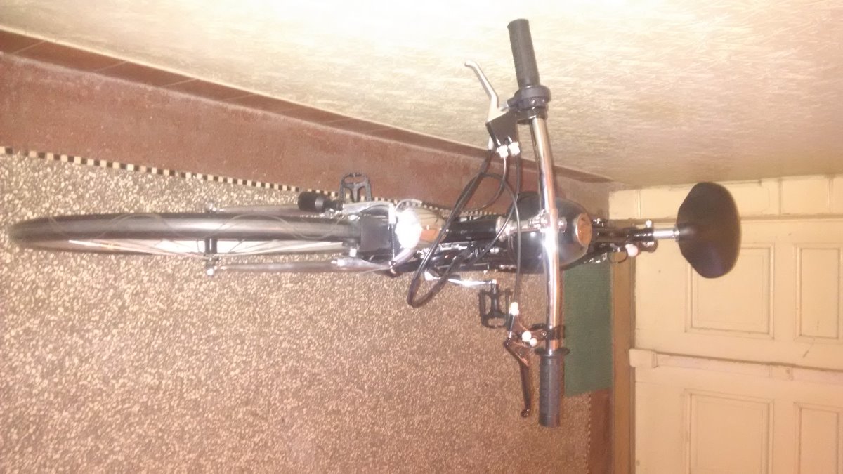Jako základ jsem použil rám a vidlici ze staršího mtb, dodal nový chromovaný představec (pozor - nestandartní průměr 21,1mm - jen tak ho nenahradíte), chromovanou sedlovku a chromovaná řídítka. Kola jsou 26" s jednoduchými alu ráfky, obutá do kevlarem vyztužených silničních Continentalů. Pohon šlapáním zjednodušen a odlehčen, bez řazení, vpředu chrom kliky 38z, vzadu cvrček 18z. Osvětlení na dynamo p/z, vzadu + odrazka. Odpružené sedlo je nové. Brzdy jsou ovládány jednou pákou obě najednou, jsou nové stejně jako bowdeny a lanka.