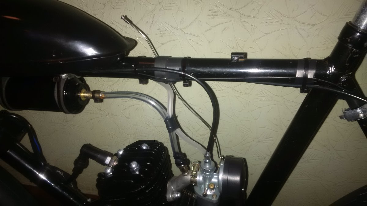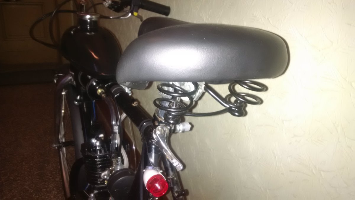 Sadu jsem koupil (novou) přes net v DE, jde o klasickou 80ccm, vyměnil jsem pojistky pístního čepu za segrovky, seřídil magneto, motor dotěsnil Hylomarem, vyměnil svíčku za Brisk N15C, vyměnil řetěz za ČZ 1/2x3/16. Boost bottle je vlastní výroby, Pokud ji nechcete, vyndám ji a namontuju nové koleno bez díry. Rozeta klasika 44z, nádrž 1,5l. Ovládání sytiče vytaženo drátem k nádrži = nemusíte se ohýbat za jízdy ke karburátoru. Oproti fotkám domontován mechanický tachometr :-)