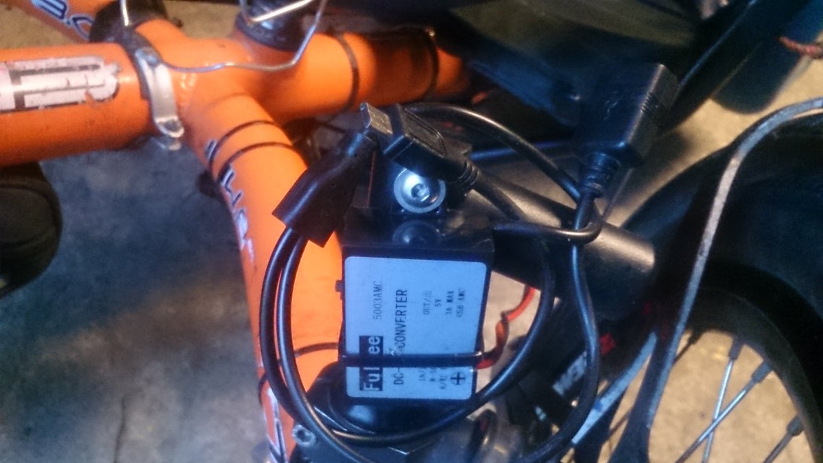 Tak předchozí dynamo z Číny 6W nebylo stavěno na trvalé zatížení. Použil jsem dc motorek též z větrné elektrárny polovicniho výkonu jak petr12, stabilizátor 8-60v/5v,3A. Nemám palubní síť, jen dobijim telefon 5" a power banku proto pritlacne provedení. I když trvaly náhon ozubenym řemínkem jak petr12 je dobrý nápad. Odběr až 1.6A, zatím najeto 600km.