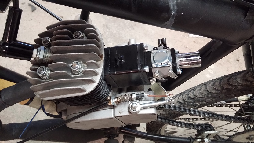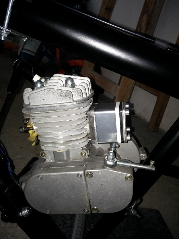 je upevněn ještě pod uložištěm motoru, na fotce je to špatně vidět, včera proběhla první testovací jízda a naprostá spokojenost, ještě malinko opticky poladím připevnění karburátoru a samotný karburátor a hurá do světa :)