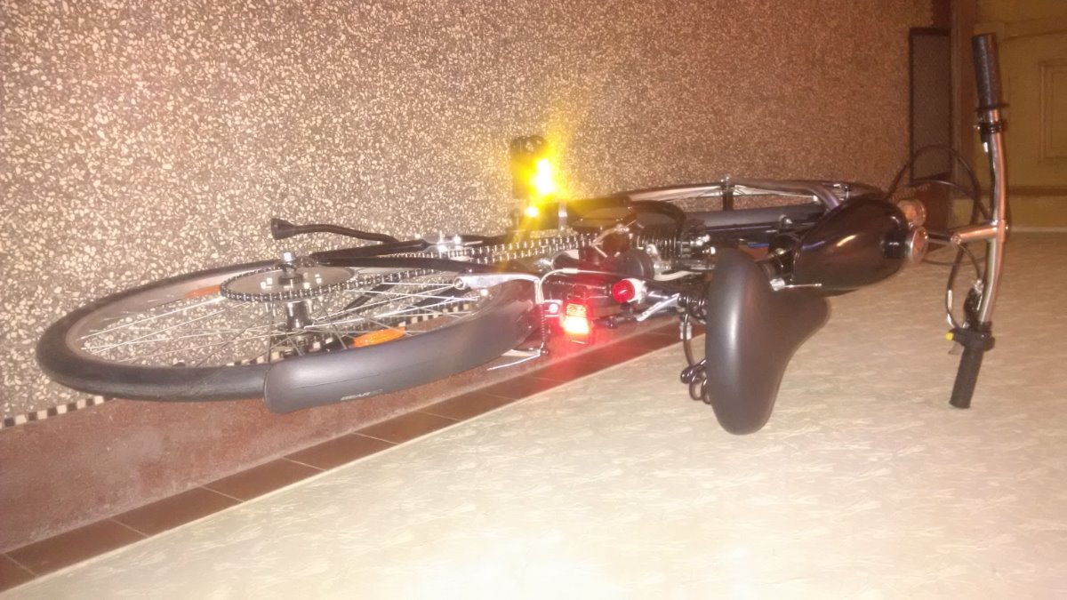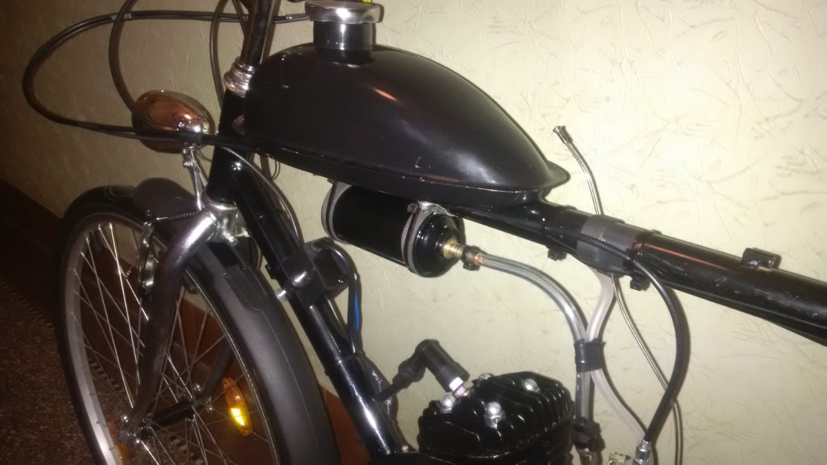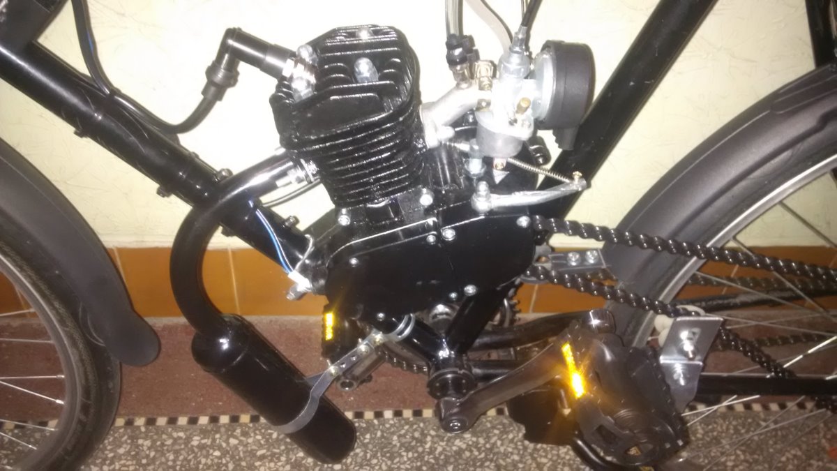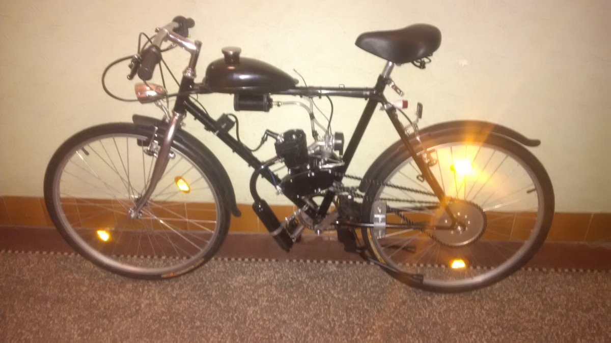 Sadu jsem koupil (novou) přes net v DE, jde o klasickou 80ccm, vyměnil jsem pojistky pístního čepu za segrovky, seřídil magneto, motor dotěsnil Hylomarem, vyměnil svíčku za Brisk N15C, vyměnil řetěz za ČZ 1/2x3/16. Boost bottle je vlastní výroby, Pokud ji nechcete, vyndám ji a namontuju nové koleno bez díry. Rozeta klasika 44z, nádrž 1,5l. Ovládání sytiče vytaženo drátem k nádrži = nemusíte se ohýbat za jízdy ke karburátoru. Oproti fotkám domontován mechanický tachometr :-), LED osvětlení (na baterie) a hliníkové vzpěry blatníků.