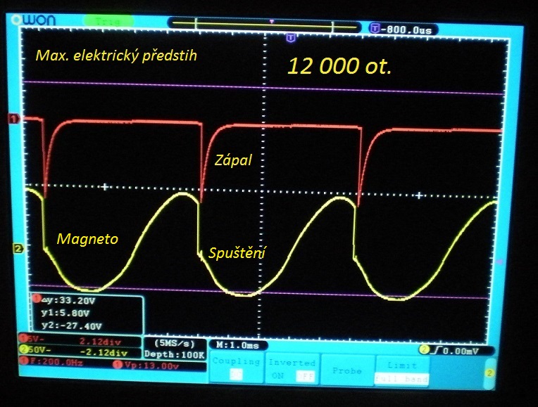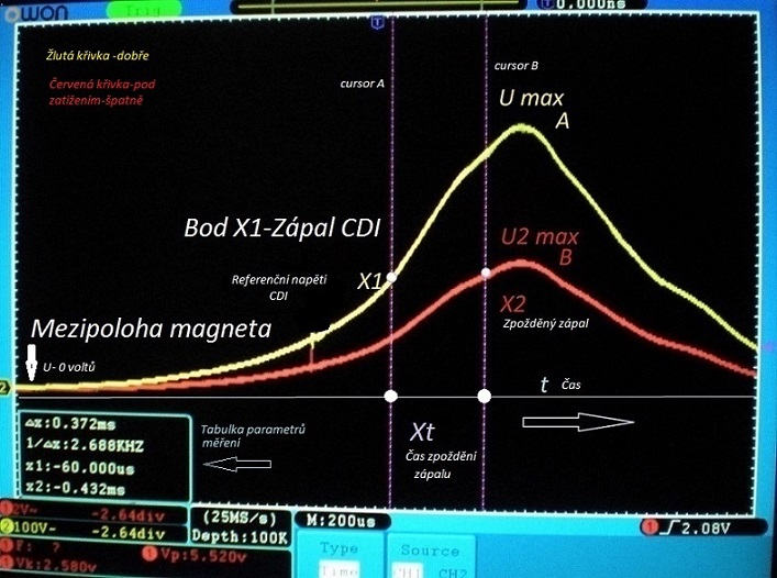 je nezatížené magneto.Červená je pod zátěží.Jasně vidíte že zápal je