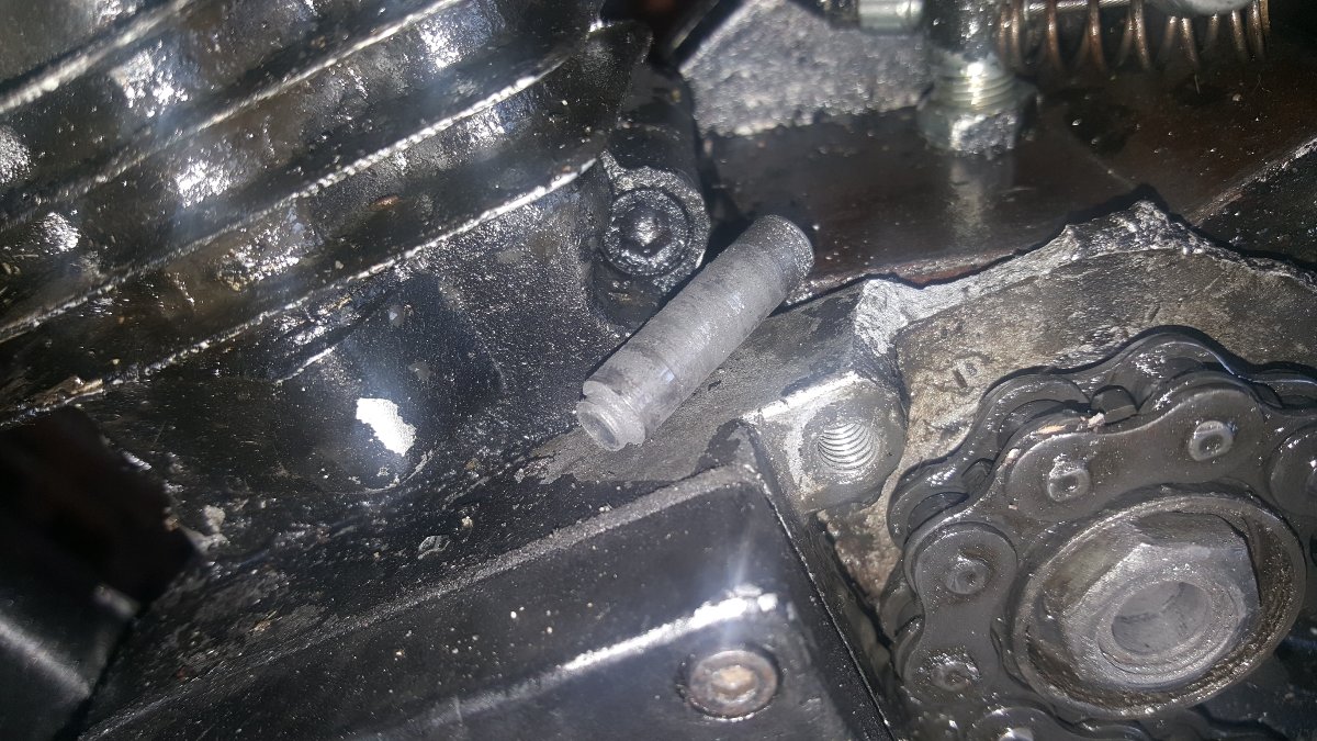 Díra do Karteru.Proč??.Při studeném startu se řetěz napne dole a stlačí napínák