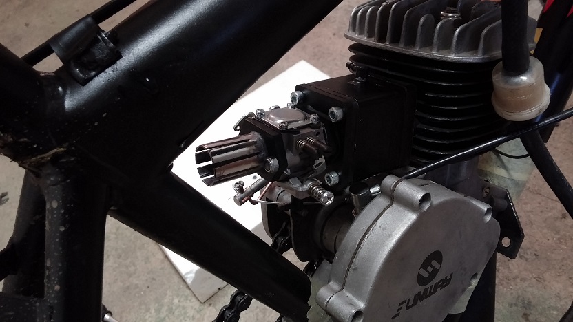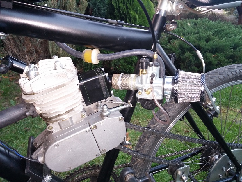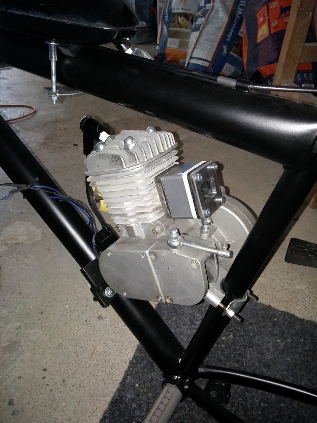je upevněn ještě pod uložištěm motoru, na fotce je to špatně vidět, včera proběhla první testovací jízda a naprostá spokojenost, ještě malinko opticky poladím připevnění karburátoru a samotný karburátor a hurá do světa :)