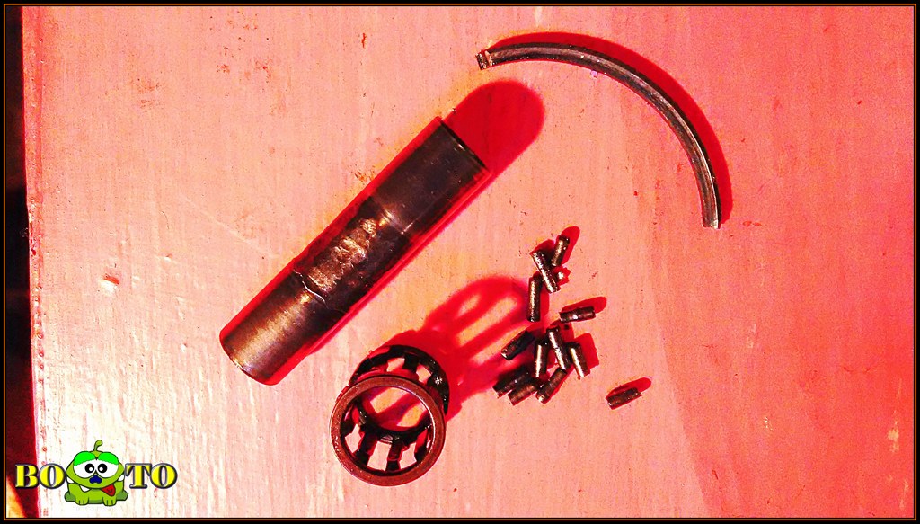 Bohužel jsem nezjistil, co se vlastně stalo. Pojistky tam zůstaly (byly už dříve odštípnuté), klec i ložisko čepu bez stopy závady. Podobně i kroužky vč. čípků. Záděr se přihlásil tak 5s před - trošku to zachrastilo, prd, bác, bum, stop.